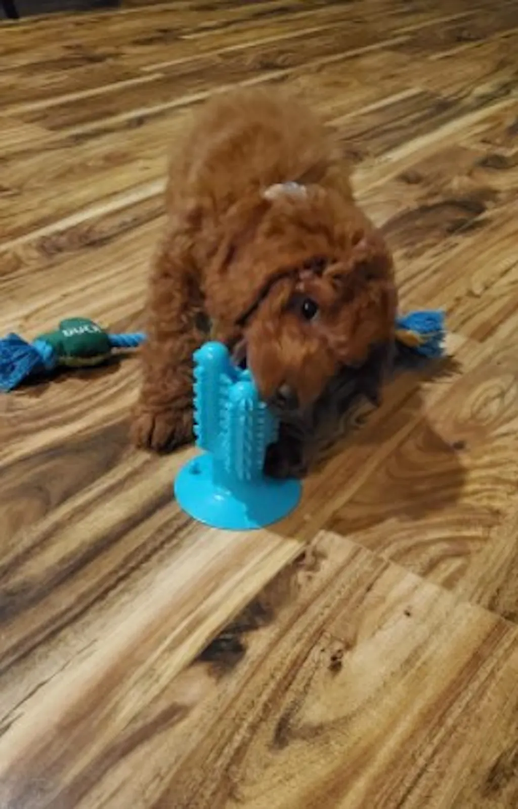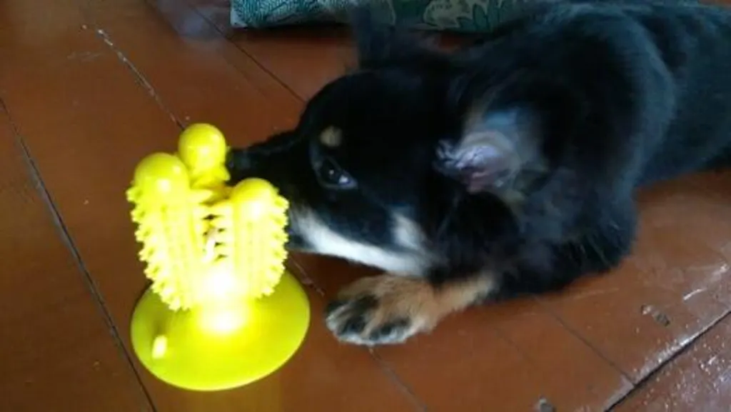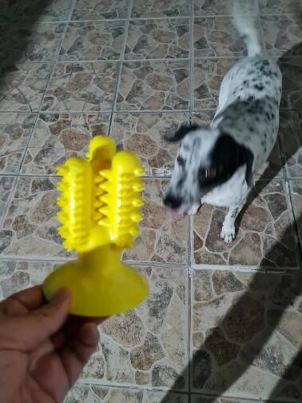 My pup enjoys his toothbrush toy. I will put a smidge of doggie toothpaste on it and sometimes add a few of his little kibble bits. If I set it on the counter he will continually jump up in the air because he wants it. Once I set it on the floor he will grab it and head to his bedroom for a chew. Once he has been chewing for a while he will then rejoin us in the living room to continue his chew. Even though he’s small he still holds it between his paws to chew on it.